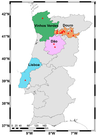 Phenological stages were recorded through site observations based on the Baggiolini scale [34] and evaluated when at least 50% of a pre-defined and time-invariant (homogeneous) subsample of plants reached the corresponding stage. Subsequently, this scale was converted to the BBCH (Biologische Bundesanstalt, Bundessortenamt und CHemische Industrie) scale [35] as follows: budburst (BBCH 07), flowering (BBCH 65), and veraison (BBCH 81). The number of plants in each subsample varies according to the wine region, being as follows: seven (Vinhos Verdes), six (Dão), seven (Lisboa), and five to ten (Douro).