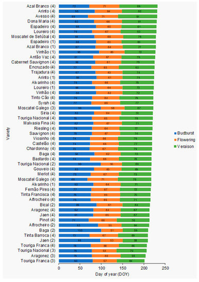 For flowering, they bear the accumulated effect of the budburst date, being cv. Touriga Nacional/Douro the earliest (DOY: 136). Furthermore, 27 intermediate red and white varieties are found in the different wine regions, with cv. Riesling/Lisboa (DOY: 143) reaching flowering six days earlier than cv. Arinto/Lisboa (DOY: 149). Among the late grape varieties, the earliest is cv. Bical/Dão (DOY: 150), whereas cv. Vinhão/Vinhos Verdes (DOY: 155) is five days delayed.