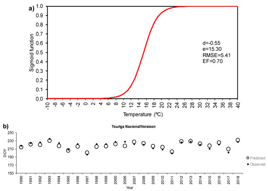 Simulation of the veraison of cv. Touriga Nacional from the Lisboa wine region. (a) sigmoid model response function. (b) Chronogram of the observed and predicted veraison dates (Julian calendar day of the year, DOY) from 1990 to 2018 (cf. legend).