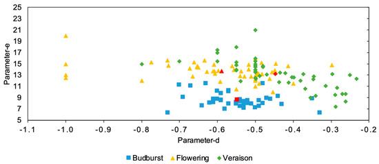 Scatterplot of the sigmoid model (SM) parameters d and e and the corresponding centroids for the three phenological stages (budburst, flowering, and veraison) in red.
