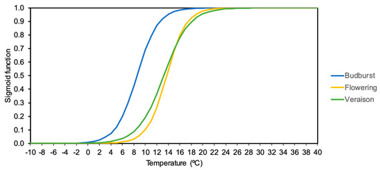 The subsequent step was to test the application of the three GSM on the basis of the centroid parameters. The performance of the GSM was also compared to the individual SM so as to assess whether the former is still useful. The resulting GSM response functions are shown in Figure 5, which demonstrates the aforementioned differences between the response functions of the phenological stages (mid-curve temperature lower in budburst and less steep curve in veraison). For budburst, the GSM parameters d and e are equal to −0.6 and 8.6, respectively. For flowering, these same parameters are of −0.6 and 13.7. Finally, for veraison, they are of −0.5 and 13.2.