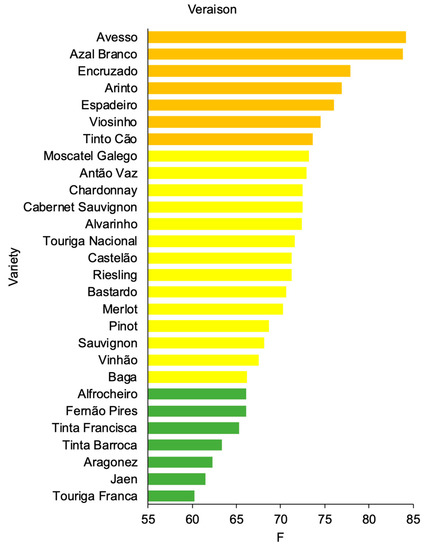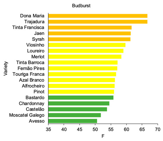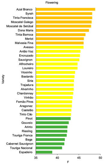 Figure 6 shows the grapevine varieties ranked as a function of their F-forcing parameter for budburst and in ascending order. For this case, cv. Avesso (F = 50.57) is the least thermally demanding. For the intermediate varieties, there are five red and four white varieties considered, being the red grape variety cv. Pinot Noir (F = 56.03) associated with the lowest forcing, whereas cv. Viosinho (F = 59.66) reveals the highest forcing. Amongst the late varieties, cv. Dona Maria (F = 66.70) is the most heat demanding. Overall, white varieties are earlier than red varieties, with lower accumulation values. For flowering (Figure 7), the earliest variety is cv. Espadeiro (F = 38.84). For the intermediate varieties, cv. Tinto Cão (F = 43.18) is the first to achieve flowering, whilst cv. Avesso (F = 46.06) is the latest. Among the late varieties, cv. Azal Branco (F = 48.78) is the most heat demanding. For veraison (Figure 8), cv. Touriga Franca (F = 60.27) is the least demanding variety. Early varieties are mostly red, except for cv. Fernão Pires (F = 66.11). For the intermediate varieties, cv. Baga (F = 66.22) is the least heat demanding, being cv. Moscatel Galego (F = 73.19). Concerning the late varieties, cv. Avesso (F = 84.23) is the most heat demanding among all the studied varieties. This outcome for cv. Avesso is remarkable, as it is the lest heat demanding variety regarding budburst but is also the most demanding variety when considering veraison.