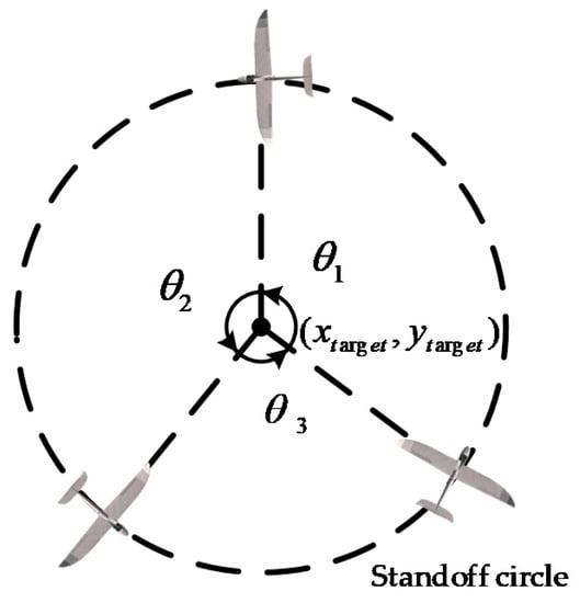 where is the UAV speed, and is the desired course. We guide the UAV toward the standoff circle by control . In the process, converges to zero.