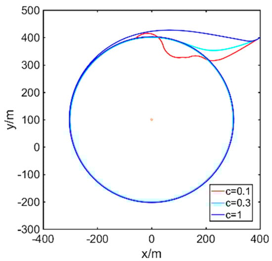 As shown in curves in Figure 4a, as goes from or to , meaning that the UAV approaches the standoff circle, the contraction component keeps decreasing, and the larger is, the faster goes down from 1, which means it spends more time converging to the desired circle. The opposite situation is shown in Figure 4b. The circulation component goes up more steeply as is less when k is near , which denotes that as becomes smaller, the convergence speed in standoff tracking is improved significantly.
