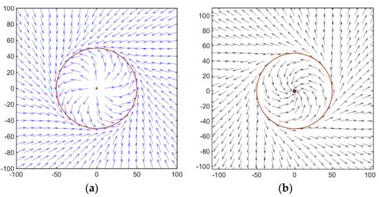 In the above equation, represents the speed of radial convergence to desired circle, and can be called a contraction component, while denotes circulation component, which denotes the tangent speed, as shown in Figure 3.