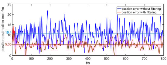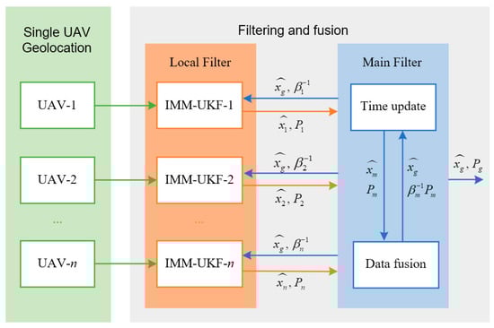 The framework of IMM-UKF with federated filter is shown in Figure 8. When tracking a moving target, every UAV localizes the target with a relatively low accuracy. The localization result will be processed using the IMM-UKF, which works well in estimating the state of the moving target. Then, the main filter collects the results of the local filter and distributes estimate results after time update and data fusion. The data fusion process with federated filter is introduced in Appendix A.