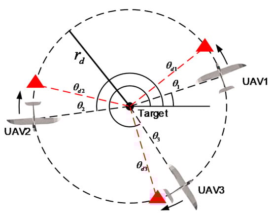 We develop a new controller based on the speed controller from Frew E W [], which can achieve faster convergence. Different from the original method, we set an ideal seat for each UAV. These ideal seats are evenly spaced around the circle. Then, the speed controller is utilized to guide each UAV to its ideal seat by controlling the speed. As a result, the team of UAVs will be evenly distributed on the circle. Without loss of generality, we adopt three UAVs to perform the tracking mission, and UAV1, UAV2, and UAV3 are arranged counterclockwise, as shown in Figure 9.
