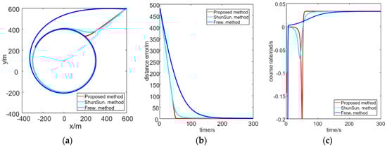 In the analysis of Shun Sun [], when c becomes larger, the vector field converges slowly but can keep a distance from the prescribed radius stably; on the contrary, if c becomes smaller, the convergence time reduces sharply. However, in this situation, it is time-consuming on stabilization, where the UAV travels in and out of the loiter circle. Shun Sun copes with this problem by designing a series of guidance functions and searching for the optimal one before the UAV performs the mission. Obviously, offline search cannot adapt to the application scenario where the target is uncooperative with UAVs owing to the computing burden. In light of the above work, we will design a guidance function simultaneously taking into account both fast convergence and stable tracking performance in an online manner, which means we can adaptively balance the converging speed and stable tracking in real time.