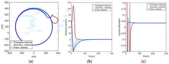 The Lyapunov vector field and inverse Lyapunov vector field can be shown intuitively in Figure 7. As shown in Figure 7, the vectors in the ILVF point away from the standoff circle.