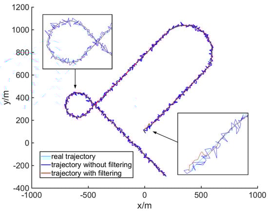 When tracking a ground moving target, the UAVs need to modify the guidance laws using the state of the target. The access to the location and velocity of the target is of vital importance to standoff tracking. In the past research of guidance laws in standoff tracking, some researchers [,,,] simplify the problem by assuming that the state of the target is available. They assumed that the state of the target can be obtained via direct communication with a cooperative ground vehicle, or continuous data for the target state are used in experiments. It is obviously not realistic when tracking an uncooperative target. Other researchers take tighter experimental conditions into consideration. In Seungkeun Kim’s research [], the state-vector fusion based on the extend Kalman filter (EKF) was utilized to estimate the state of the moving target for two UAVs. Summers T.H et al. [] took unknown wind and target motions into one variable and proposed an adaptive estimator for a more accurate estimation of the unknown factor. A jerk model for tracking highly maneuvering targets was utilized in Qian Z’s work []. In cooperative tracking of the moving target, Hu C. et al. [] applied squared-root cubature information filtering for data processing from four quadrotor UAVs, and the consensus algorithm is used in order to improve estimation accuracy. The methods mentioned above mostly cannot estimate the state of a maneuvering target satisfactorily or are not suitable for fixed-wing UAVs.
