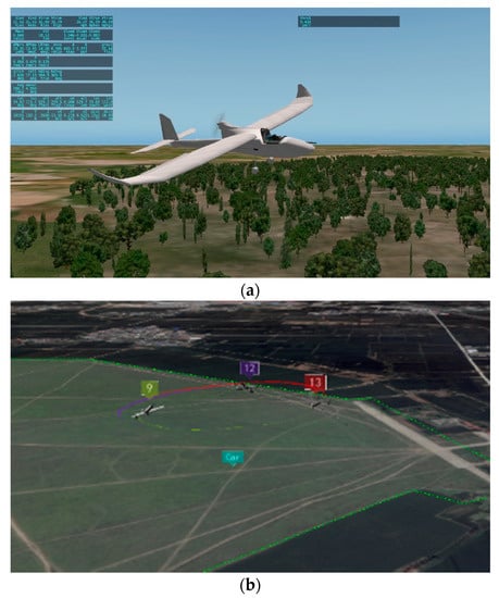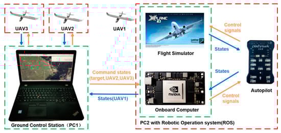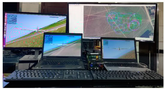The high-fidelity aircraft simulation software X-plane 10 is a comprehensive and powerful flight simulator for the personal computer, which is often used in HIL simulation [,]. We choose the HILStar 17F aircraft as the controlled object. Pixhawk 4 autopilot controls the UAV to fly along the commands. The onboard computer receives the states of the target and other UAVs and sends control policies generated by the proposed algorithm to Pixhawk 4. The ground control station monitors the states of the target and all UAVs, which are distributed to each UAV, and can control multiple UAVs by switch control modes.