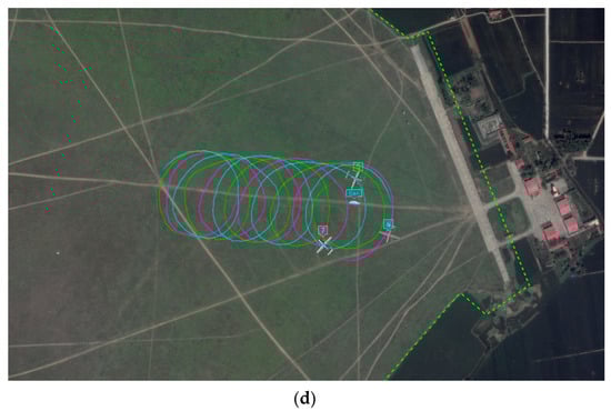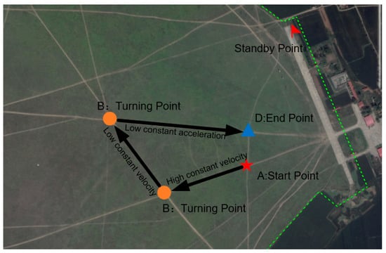 As shown in Figure 19, the simulation environment is designed as follows: As soon as the fixed-wing UAVs takes off from the runway, they hover over the standby point until receiving the “tracking” command. Then, they track the ground moving target under the command generated by the tracking algorithm. The moving target moves from start point A, and finally stops at the end point D, passing the turning points B and C. The target moves at a relatively high speed from A to B, and a relatively low speed from B to C. After a sharp turn on the right at C, the target moves at a constant acceleration at and stops at D.