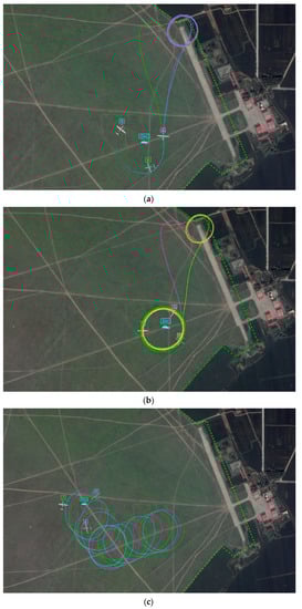 As shown in Figure 20, three UAVs cooperatively track the target moving on ground of which the trajectories are described in Figure 19. In Figure 20a, UAVs clump around the start point after receiving “tracking” command at the standby point. UAVs are distributed evenly around the standoff circle by adjusting speed in Figure 20b. Figure 20c illustrates the cooperative tracking of the target moving at a constant velocity, while the trajectories of UAVs tracking accelerating targets are shown in Figure 20d. We can intuitively see that the team of three UAVs can cooperatively track the target moving on ground, distributed in a circle with a suitable angular difference.