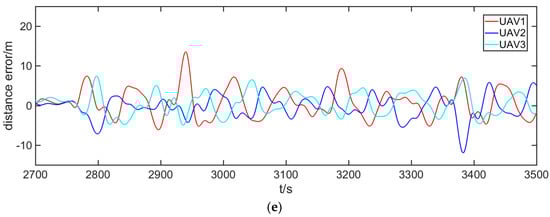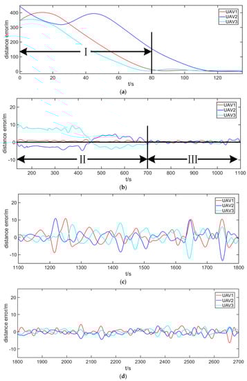 The details of tracking performance are listed in Figure 21 and Figure 22. In the ‘gathering’ stage shown in Figure 21a and Figure 22a, the distance error deceases rapidly to zero as UAVs fly toward the start point at the maximum speed. In the early stage, such as interval (I) in Figure 21a and Figure 22a, UAVs hover over the standby point, which is far away from the start point, so the phase difference relative to the target undergoes drastic changes.