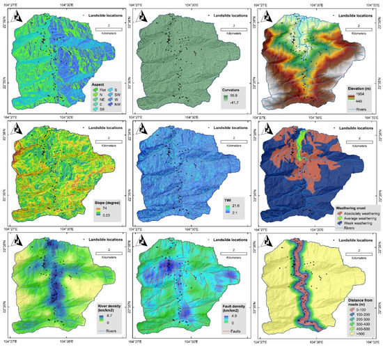 Modeling of landslide susceptibility is the process of investigating the associations between historical landslides and a suit of explanatory variables known as landslide conditioning factors that typically characterize the geomorphology, hydrology, climate, and anthropogenic conditions of the research area [49,53]. For modeling the landslide susceptibility in the Nam Dan commune, ten conditioning factors were selected and used: slope aspect, slope degree, elevation, curvature, topographic wetness index (TWI), weathering crust, river density, fault density, distance from roads, and geomorphology. Maps of these factors are presented in Figure 3 and Figure 4. Currently, the development of data processing techniques and the data-sharing policies of companies, such as NASA, has facilitated the collection of such conditioning factors. Slope aspect is a widely used topography factor for landslide susceptibility mapping because this factor has a relationship with many other factors, such as solar radiation and rainfall amount, that affect landsliding [54]. Slope degree is a significant factor for modeling landslide susceptibility due to its weighty effects on the sliding of material and flow of water [55]. Elevation characterizes local climate condition and the resistance of the slope-forming materials to failure [56]. Curvature affects the accumulation and flow of water on terrain surface, thus influencing the probability of landslide occurrences [57]. TWI was selected as another conditioning factor because this factors in the relationships between topography and moisture [58]. The thematic map for these five topography factors was derived from a 10-m Digital Elevation Model (DEM) that was constructed using 1:10,000 topographic maps. A weathering crust was selected in this study to represent the difference between the weathering conditions of the rocks that in turn influence the probability of landsliding [59]. Data for the weathering crust were derived from the 1:10,000 geomorphology map, prepared by the SRV-10/0026 project. Rivers generally adversely affect the stability of slopes due to erosion and scouring of the side slopes of the valley and saturation of the groundmass within flood height [60,61]. Therefore, the inclusion of the information related to rivers is vital for landslide modeling and mapping. In this study, the rivers of the Nam Dan commune were derived from the DEM and used to generate a thematic map of river density. Faults induce instability in the ground and rock mass that typically lead to landslides [62,63]. In this study, faults were interpolated from the SAR images (Cosmos Skymed with descending orbit, band X, 3m resolution) and used to generate a thematic map of fault density for the Nam Dan commune. Road construction is the main causes of landslide occurrences in many regions [64]. A thematic map of distance to roads is usually used as a proxy for explaining the effects of human activities on landsliding. In this study, the road networks of the Nam Dan commune were derived from a topographic map with a scale of 1:10,000. Geology is another important factor for landslide susceptibility modeling because this factor reflects the rockmass/groundmass condition of the Nam Dan commune for the stability analysis [65]. In this study, geological units of the Nam Dan commune were identified using the geological map of the General Department of Geology and Minerals of Vietnam.
