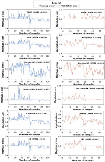 In the matter of the magnitude of the training and validation error, the ensemble ABHP and Decorate-HP models with the lowest and highest RMSEs were identified as the most and least accurate models, respectively. The RMSEs ranged from 0.334 (ABHP) to 0.495 (Decorate-HP) in the training phase and from 0.362 (ABHP) to 0.496 (Decorate-HP) in the validation phase of the modeling process (Figure 5).