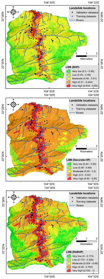 When the HP models and its five ensemble models were successfully trained and validated using the training and verified datasets, they were used to generate the landslide susceptibility maps. To do so, we first computed the landslide susceptibility indices for all pixels of the study area, and then categorized the indices into different classes that depicted very low, low, moderate, high, and very high susceptibility to landslide occurrence within the Nam Dam commune [5].
