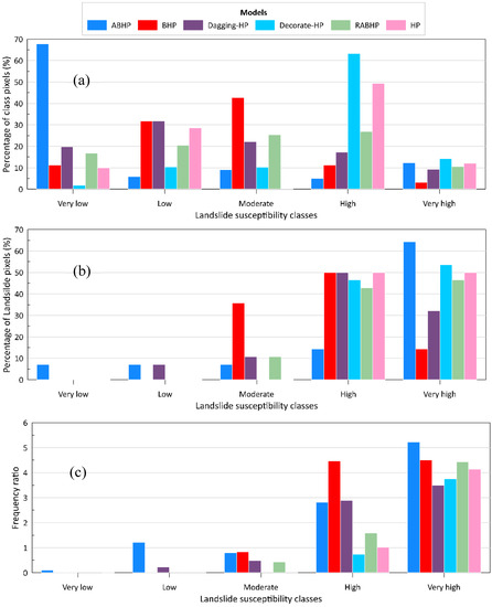 The frequency ratio analysis of the susceptibility maps revealed that the map derived from the ABHP model was the most trustworthy map in comparison with the other maps derived from the other five models. The percentage and frequency of landslide pixels in the ABHP maps for the high and very high susceptibility classes were higher than the other models (Figure 8b,c).
