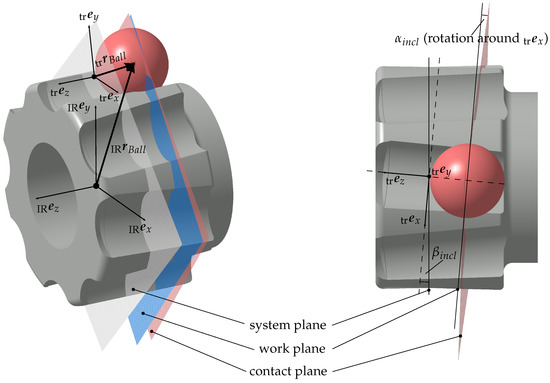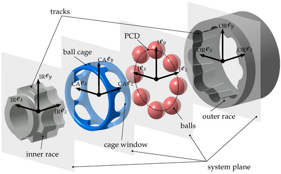 To analyse the joint kinematics using multi-body simulation, it is first necessary to define suitable coordinate systems. Therefore, a Cartesian inertial system is introduced, whose global z-axis corresponds to the rotational axis of the outer race. In addition, body-fixed coordinate systems are defined on the inner race , the outer race and the cage , whose origins lie in the joint system plane (see Figure 1). Starting from the body-fixed coordinate systems, several coordinate systems are introduced for each track and for each cage window. While the alignment of the coordinate systems in the cage window corresponds to the cage fixed coordinate system, the track coordinate systems follow the track orientation with the two track angles and . The transformation into the track coordinate system is performed sequentially using the matrix