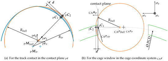 An analytical approach is also chosen for the cage ball contact, but this is implemented three-dimensionally (see Figure 3b). First, a contact plane is defined on the respective window edge by a normal vector and a receiving point in the body fixed cage coordinate system . Then, a potential contact point on the sphere surface
