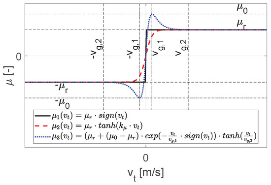 The behaviour of the friction coefficient is not represented by a simple signum function (see Figure 5, ), but is approximated for numerical conversion by a continuously differentiable function, so that a discontinuity at is avoided (see Figure 5, ). Normally, adhesive forces between the contact bodies are taken into account in the multi-body simulation via switching functions. However, this requires a high numerical effort. To be able to approximate adhesive forces at low relative velocities avoiding switching functions, the following approach according to Daniel [13] is used