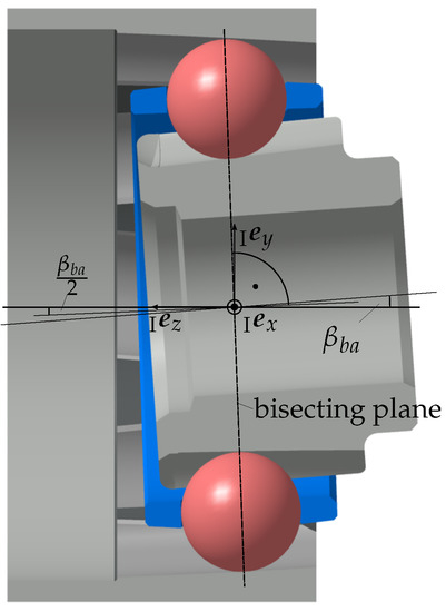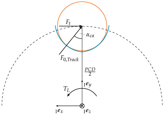 with the load torque , the number of balls m, the and the nominal contact angle . The derivation of Equation (23) is illustrated in Figure 9. For the cage contact forces, Equation (24) can be used
