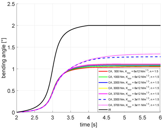 Cage deflection angle at different load torques for several equivalent contact stiffnesses .