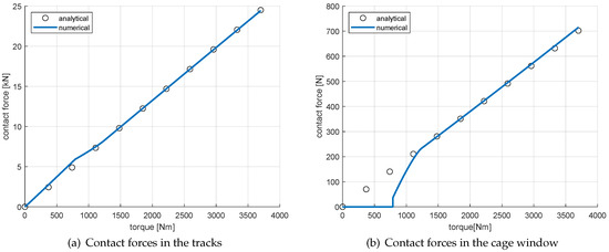 In addition to the homokinetic condition, the model is verified with regard to the contact forces occurring in the tracks and cage windows. For this purpose, a comparison with analytical calculation results for the statically undeflected joint condition is made. The force curves determined are shown in Figure 8. In a first approximation, the small inclination angles of the tracks can be neglected so that the analytical contact forces can be calculated using Equation (23) for the track contact forces