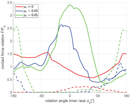 Track contact forces using different friction coefficients: solid line, track flank in load direction; dashed line, counter track flank (opposite load direction); and contact force relation , track force F related to for undeflected joint condition.
