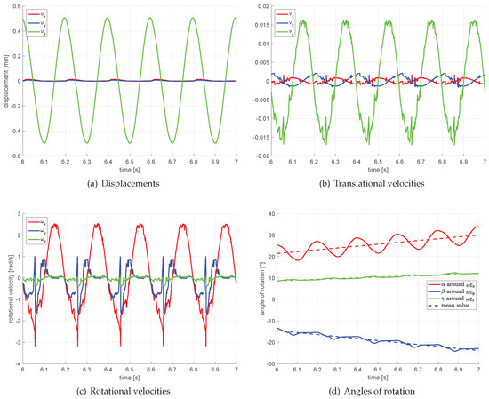 where is the mass matrix, is the acceleration vector, is the vector of external forces and moments and is the vector of centrifugal, gyroscopic and Coriolis forces. A derivation of the individual components can be found in [14,15]. Considering only free bodies, the analysis is performed using an ODE solver for the numerical solution of the differential equation. For this reason, the ODE of second order must be transformed into a differential equation system of first order. For this purpose, the state space vector and its time derivative