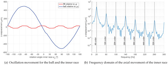 Due to the periodic, alternating track arrangement, the inner race in the CVJ moves axially under deflection during rotation, since a resulting force effect in this direction is produced by the individual track forces. The magnitude of the oscillation that occurs depends on the external load factors. It can be generally stated that it increases proportionally with the deflection angle and rotational speed. For the following analysis, as before, a rotational speed of 300 rpm, a deflection angle of 2 and a load torque of 2000 Nm were used.