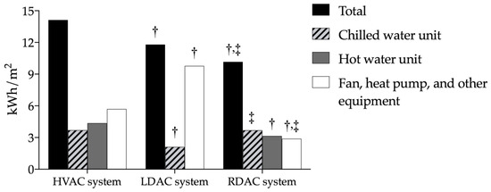 Daily energy consumption in HVAC, LDAC, and RDAC systems. †: compared to HVAC system, p < 0.01; ‡: compared to LDAC system, p < 0.01.
