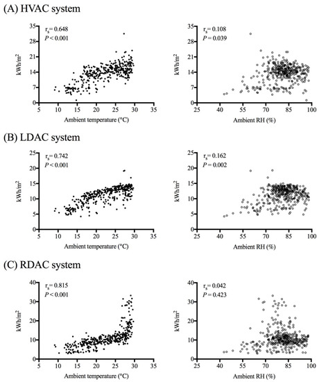 Association between daily ambient temperature/RH and daily total energy consumptions of HVAC (A), LDAC (B), and RDAC (C) systems.