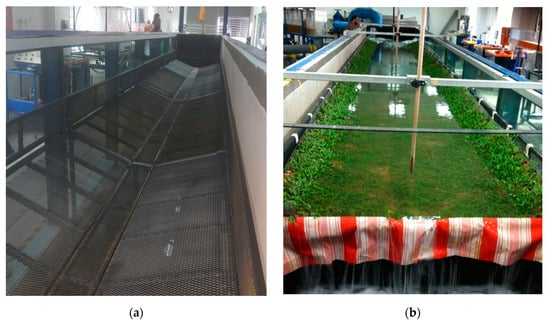 The simulation of the natural channel with a grass-covered boundary was performed by placing a thick topsoil layer (15 cm thick) evenly covered with cow grass (Axonopus compressus) of around 100 mm height on the channel base and side slopes (Figure 1b). The texture of the topsoil was composed of 76% sand, 8% silt and clay, and 16% organic matter.