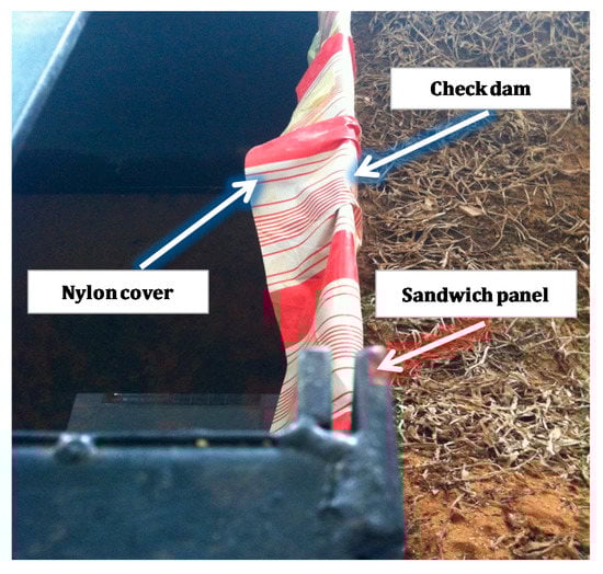 Erosion from infiltrated water was prevented by placing a permeable sheet in between the soil and the perforated channel steel sheets. A check dam was installed at the end of the channel using a steel plate that could be fixed by an adjustable sandwich panel (Figure 2).