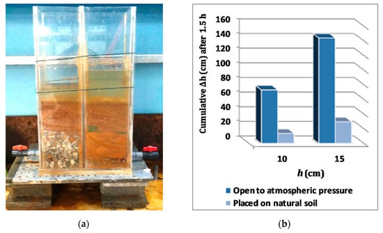 The laboratory conducted to measure the infiltration rates through a topsoil, open to atmospheric pressure and with natural soil boundaries: (a) the physical model with identical vertical columns (b); the cumulative infiltration after 1.5 h. [21]