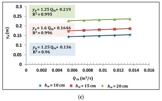 The time taken to reach the peak, tp (min), was found to vary with the inflow rate and downstream check dam height. Table 2 shows that tp varied in the range of 1.17 to 6.4 min. It was found to decrease with the increase of inflow rate and increase with the increase of downstream check dam height. The relation between tp (min) and the inflow rate for grassed channels at hw = 10, 15, and 20 cm is shown in Figure 6b. The non-linear model developed to define the relationship is also shown in Figure 6b, which can be used for the estimation of tp (min) from inflow for different dam heights. Table 2 shows increases in channel water level with the increase in the rate of inflow when all other factors are kept constant. The water level at peak flow was varied with inflow rate for different check dam heights, hw (Figure 6c). A linear relationship between water level at peak flow and inflow rate was observed for different heights. The regression models are also shown in Figure 6c. The results showed a slight increase in water levels at peak flow with the increase in inflow rate.