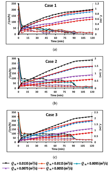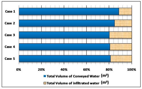 Figure 11 presents the variations in F over time for the five considered cases. Figure 11a–c shows a higher value of F for a higher value of hw at all channel sections. For the comparisons among Figure 11c–e, the values of F in all sections were summed at a specific time due to the differences of section lengths. The comparison revealed that a decrease in spacing of check dams had a very low impact on the infiltration rate. For more clarification, the total inflow, outflow, and infiltration volumes after 90 min for the five cases are presented in Table 4, whereas Figure 12 shows a comparison of the percentage of the total volume of conveyed water and the total volume of infiltrated water.