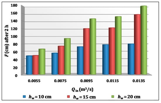 The infiltration rate fp and cumulative infiltration F for the grassed channel at varying inflow rates were estimated for different heights of check dam, hw = 10, 15, and 20 cm, as shown in Figure 7a–c, respectively. The values of F for each inflow rate over time was consistently more for the higher values of hw. For the sake of clarity, the values of F after 2 h for three heights of check dam are presented in Figure 8. The figure shows a clear increase in F after 2 h with the increase of hw, irrespective of inflow rates. However, the changes in F for the three values of hw showed more increase for higher flow rates due to the increase in water level and the associated decrease in velocity (Table 2).