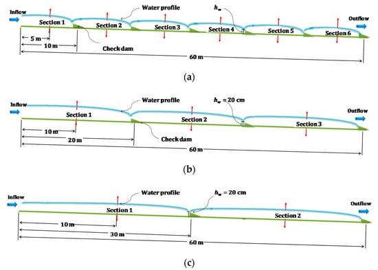 The influence of check dam heights and spacings of a grassed channel on the amount of runoff reduction by infiltration process was evaluated using the newly developed model. It was assumed that the channel section was trapezoidal with a length = 60 m, bottom width = 0.2 m, side slope m = 3, and longitudinal slope = 0.3%. The channel was assumed to be uniformly covered with a similar type of soil and grass cover. A steady inflow rate of Q = 0.055 m3/s was considered as a design discharge. The effects of check dam heights and spacing on the infiltration rate of grassed channel were investigated using five check dam system cases, as detailed in Table 3. Different sections were created in the grassed channel to represent the spacing between two check dams (Figure 9). The evaluation of the water depth, flow variations, and infiltration rates was performed at the middle of each channel section.