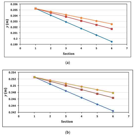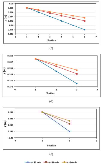 The values of td, tp, and y for all design cases were calculated by fitted non-linear regression equations, as shown in Figure 6a–c. For example, the value of y (m) for Section 1 in case 1 was determined using the equation presented in Figure 6c. The obtained values of Qin and yp were 0.055 m3/s and 0.2053 m, respectively. The depth was observed to decrease along the channel due to an infiltration-induced reduction of flow rate. The equations in Figure 6a,b were used to calculate the values of td and tp at Section 1 for hw = 10 cm, L = 10 m, and Qin = 0.055 m3/s. Obtained values were td1 = 0.244 min (or 14.6 s), and tp1 = 0.284 min (or 17 s). The values of td and tp for the rest of the sections were calculated in the same manner by considering the flow rates. Moreover, the flow variations at channel sections and related water levels were estimated from the infiltration rate at different times. Because Figure 6a,b was developed from a channel with 10 m spacing of downstream check dams, the values of td and tp were multiplied by 2 and 3 in cases 4 and 5, respectively, in order to fit their spacing of 20 and 30 m (Figure 9). The differences in the water levels for different check dam design cases are shown in Figure 10. The figure shows a decrease in the water level in the downstream of the channel due to infiltration through the channel. However, the water level showed a time-dependent increase in each section due to the lower rate of infiltration along the channel over time.