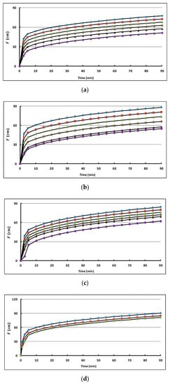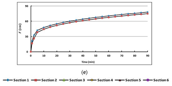 The values of cumulative infiltration F for different times for the five check dam design cases: (a) case 1; (b) case 2; (c) case 3; (d) case 4; (e) case 5.