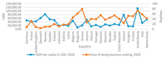Over the past 29 years, many EU member countries under evaluation purposed considerable economic gains compared with the global level. Next, indicators such as GDP per capita (USD), the ease of doing business ranking and a few others are considered as examples (see Table A1 and Figure 2).