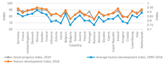 Figure 3. Social progress index, 2019, and HDI, 2018, and average HDI, 1990–2018, values in analysed countries.