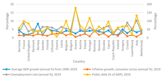 Figure 4. Average GDP growth, 1990–2019, unemployment rate, 2019, inflation growth, 2019, and public debt, 2019, values in analysed countries.