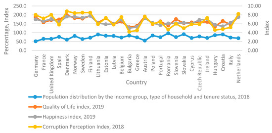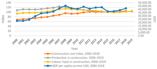 The values for the indicators were obtained from the human development index [71], GDP growth data (annual %) [72,73,74,75], GDP per capita in PPP terms [75,76,77], inflation growth data, consumer prices (annual %) [78], unemployment rates (annual %) [79,80], the ease of doing business ranking [81], the labour productivity per person employed in 1991 USD (converted at Geary Khamis PPPs) [82], public debt (% of GDP) [83,84,85], the education index [71], the happiness index [86], the social progress index [87,88,89,90,91,92], the construction cost index (residential buildings, except for community housing) in national currency (index, 2015 = 100) [93], the building permits index (the amount of new residential construction, except for community housing) (index, 2015 = 100) [94], the production in construction (production volume index) (index, 2015 = 100) [95] and the labour input in construction (number of persons employed) (index, 2015 = 100) [96] (see Table 1).