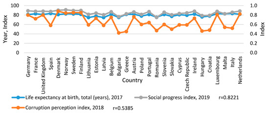 Lithuania and Portugal in Table A1 can be examples for discussion. The evaluation of the 1990–2019 period shows that, at 4.22%, Lithuania recorded a similar average annual GDP growth to Portugal with 4.16%. The 2019 data show that the GDP per capita in PPP terms was lower in Portugal (30,487.7 USD) than in Lithuania (32,378.6 USD). At 8.81, the average 1999–2019 unemployment rate in Portugal was about 21% lower than that in Lithuania (10.89), and the 2019 unemployment rate in Portugal (6.10) was equal to that in Lithuania (6.10). Between 1995 and 2019, the average inflation growth in Lithuania (3.65%) was 1.825 times as high as in Portugal (2.00%). During 1990–2018, the average labour productivity per person employed was greater in Portugal (58,505.00 USD) than it was in Lithuania (45,530.00 USD) in 1990 USD terms (converted at Geary Khamis PPPs). However, the average public debt levels between 2000 and 2019 show that Portugal’s debt burden, at 92.42%, was higher than that of Lithuania (29.12%). The conditions of the business environment better in Lithuania than in Portugal. Lithuania ranked 11th and Portugal 39th in the 2020 ease of doing business index; the average for 2006–2020, meanwhile, shows that Lithuania (21st) offered better conditions in terms of the ease of doing business than Portugal (34th) had. The human development index in 2018 is similar in both countries, in Portugal 0.85 and Lithuania 0.87. The education index in 2018 in Portugal (0.76) is less than in Lithuania (0.89). Conversely, appreciate the social progress index 2019 index is bigger in Portugal (87.12) than in Lithuania (81.30). It is clear from the summary of all 16 indicators under evaluation that, in four instances, Lithuania performed better than Portugal. The remaining 13 indicators, however, show Portugal performing better than Lithuania. The combination of these comparative data reflects the results of the multiple criteria assessment (see Table 2), showing that, in terms of the criteria considered here, Lithuania (a8) scored better (priority P8 = 13 and utility degree N8 = 72.42%) [52]. Portugal (a16) ranked 18th with its utility degree N16 = 67.41% (see Table 2).