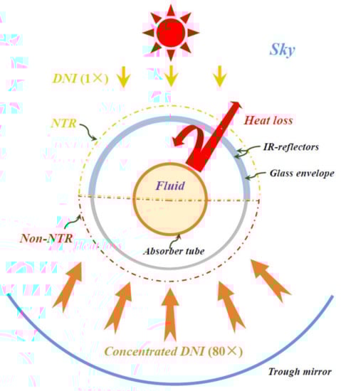Material properties enhancements of the key components in the HCE are the solutions popularly employed by researchers to reduce the heat loss of HCEs. For instance, SSC with lower emittance has been studied and developed for a long time. Up to now, the emittance of state-of-the-art SSC is about 0.09 at 400 °C []; the room for the further decrease of emittance is small because the absorptance of SSC would suffer much with the lower emittance. Therefore, the solution by enhancing the properties of materials hardly exerts effective role in reducing the heat loss. In our previous study [], we discovered and proposed the negative thermal-flux region (negative energy-flow region) which occurs in approximately upper half of HCE; the discovery of the negative thermal-flux region (NTR) spawned novel optimization methods to effectively reduce the heat loss and improve the overall performance of HCEs. Taking the EuroTrough collector and Schott PTR70 solar receiver as an example []: due to the special structural characteristics of the PTC system, the HCE receives 80 times direct normal irradiance (80× DNI) at the approximately lower half of the HCE facing the trough mirrors, but only receives one direct normal irradiance (1× DNI) at the upper half of the HCE facing the sun as shown in Figure 1. This fact causes a phenomenon that the heat loss of the HCE in the upper half would exceed the absorbed solar energy in this part when the operating temperature is high enough. Consequently, the phenomenon of negative net heat gain in the upper half occurs, and this part in the HCE is thus named as the negative thermal-flux region (see literature [] for more detail information). Therefore, the reduction of heat loss is vital for the improvement of the net heat gain of the HCE in the NTR. In this framework, an optimization method by depositing IR-reflector coatings on the glass envelope of the HCE in the NTR to reduce the heat loss in the NTR was proposed.
