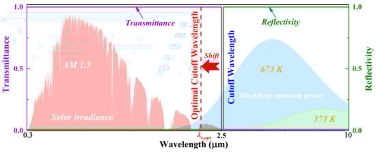 IR-reflector coating, which has high reflectance in the infrared wavelength band and high transmittance in the solar irradiance wavelength band, was employed and deposited on the inner and outer surfaces of glass envelope in the (NTR as shown in Figure 1 []. IR-reflector coating on the inner surface of glass envelope can effectively block the infrared emissive heat loss from the absorber tube in the NTR, and the IR-reflector coating on the outer surface of glass envelope can reduce the emissive heat loss from the glass envelope due to its low infrared emittance. However, the IR-reflector coatings would inevitably incur the solar irradiance loss due to the reduced transmittance of the glass envelope with IR-reflector coatings. Taking the actual transparent conductive oxide (TCO) film [] as an example, the solar irradiance transmittance of this IR-reflector is 69.9%, which means approximately 30% of the incoming solar irradiance cannot pass through the TCO film, thus forming additional solar irradiance loss. Generally, an ideal IR-reflector is designed with a determined cutoff wavelength (λc) at which the spectral property of material, such as spectral transmittance, spectral reflectance, changes sharply (Figure 2). The value of λc is usually selected as the fixed value of 2.5 μm to obtain the maximum solar transmittance in the case of lower service temperature. This is because the blackbody’s emissive power from the surroundings under lower temperature mainly locates in infrared wavelength band above 2.5 μm (such as 373 K exhibited in Figure 2), that coincides well with the spectral selectivity of IR-reflector with a fixed cutoff wavelength of 2.5 μm. In the case of high service temperature such as 400~550 °C in HCEs, a conventional ideal IR-reflector with the cutoff wavelength of 2.5 μm still enables the vast majority of solar irradiance to pass through, but the effectiveness of blockage of emissive heat loss of the HCE in the NTR is definitely reduced. This is because the emissive heat loss of the HCE at high temperatures explosively increases, and the main wavelength band at which blackbody’s emissive power from the absorber tube locates would shift to lower wavelength (such as 673 K exhibited in Figure 2) [], these two factors result in the escape of a fair amount of heat loss below 2.5 μm from the absorber tube to the surroundings. In this framework, the cutoff wavelength of ideal IR-reflector coating was optimized and shifted to lower optimal cutoff wavelength (λc,opt) as shown in Figure 2. The optimized ideal IR-reflector coating optimally weighs the amount of transmitted solar irradiance and that of blocked emissive heat loss in the NTR, and thus maximizing the net heat gain in the NTR. The novel HCEs (NHCEs) with three kinds of IR-reflector (IRR) coatings, namely, TCO coating (NHCE-IRR-I), ideal IRR with a fixed cutoff wavelength of 2.5 μm (NHCE-IRR-II), and ideal IRR with optimal cutoff wavelength (NHCE-IRR-III), were proposed, and the heat loss performance of three kinds of NHCEs was preliminarily analyzed in the previous work [].