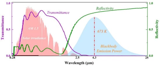 The transparent conductive oxide (TCO) film (marked as IRR-I) used in this study mainly consists of In2O3:Sn, it possesses good thermal resistance and performance stability [,]. The spectral selective characteristics of TCO film are exhibited in Figure 3. The average solar irraidance transmittance and the average reflectance of emissive radiation heat from the absorber tube at the absorber temperature of 600 °C are 0.699 and 0.639, respectively.